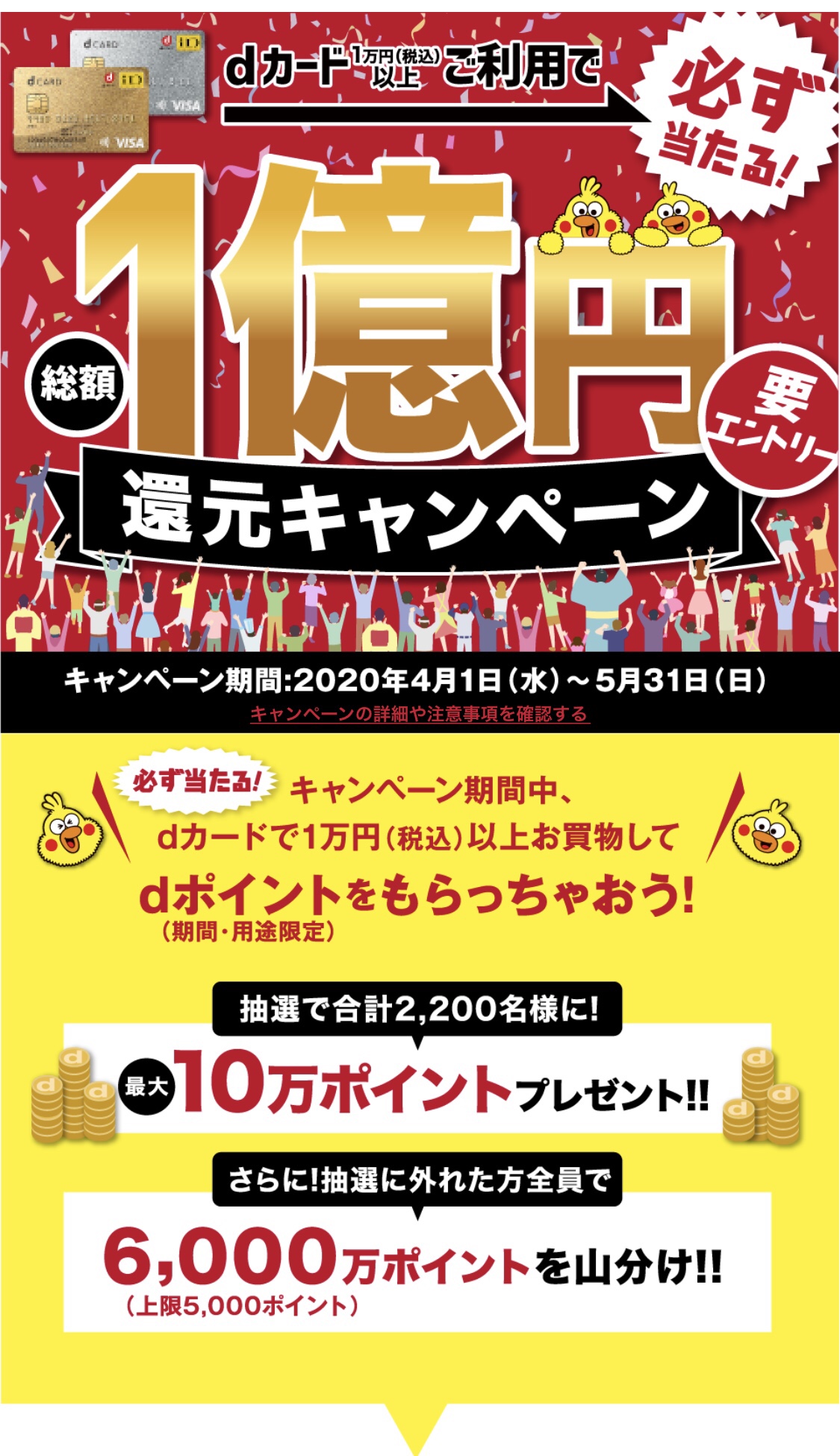 キャンペーン期間中にdカードで1万円以上の買い物(合算でもOK)をすると必ずdポイントがもらえます!